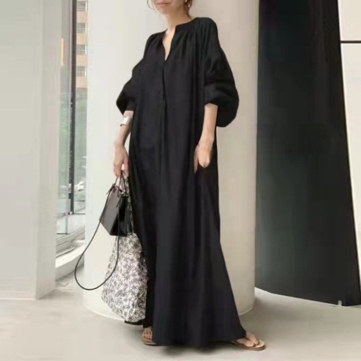 キーネック ボリュームスリーブ ロングワンピース 無地 マキシ ノーカラー シンプル リゾートレディースファッション ワンピース