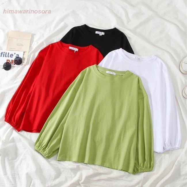 長袖シャツ レディース シャツ ゆったりシャツ 長袖 無地 バルーンスリーブ 無地シャツ クルーネック カジュアルトップス カットソー