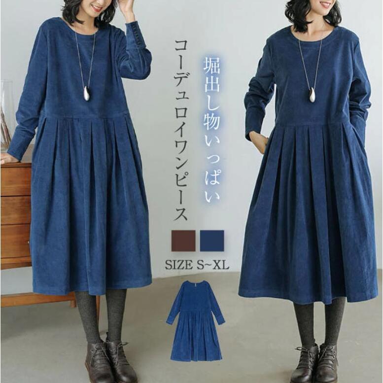 ワンピース コーデュロイ ロングワンピース レディース 春秋 冬 大きいサイズ 長袖 ロング丈 ミモレ丈 厚手 ゆったり ロングワンピ