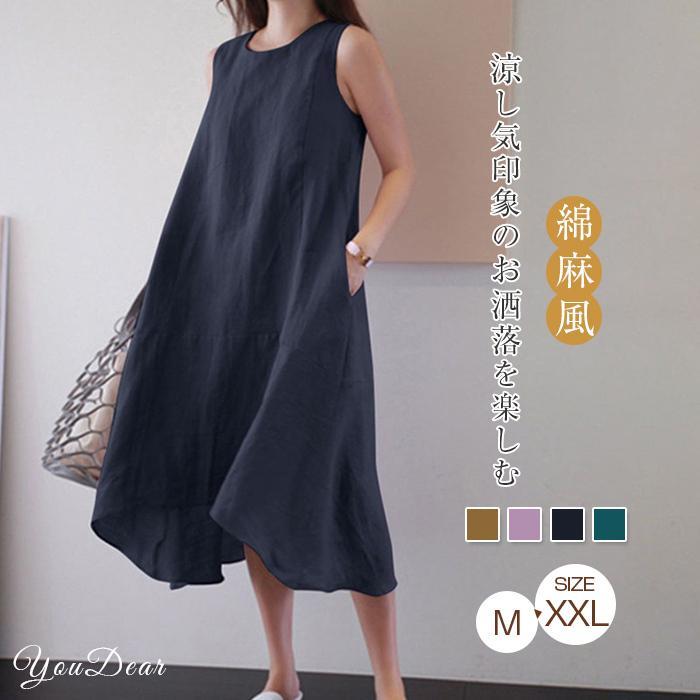 ワンピース レディース ロングワンピース リネン風 可愛い きれいめ ゆったり ノースリーブ 二の腕カバー 大きいサイズ エレガント お洒落 体型カバー