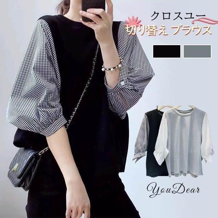 一部 ブラウス 切り替え レイヤード風 カットソー 重ね着 プリーツ切替 カジュアル ドッキング トップス レディース 春 シャツ チュニック ゆったり 夏