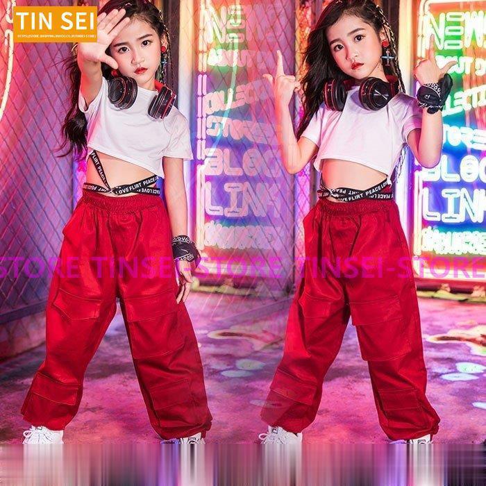 サルエルパンツ ズボン キッズ ダンス衣装 ヒップホップ ダンストップス 女の子 ジャズダンス ステージ衣装 セットアップ レッド ホワイト 練習着