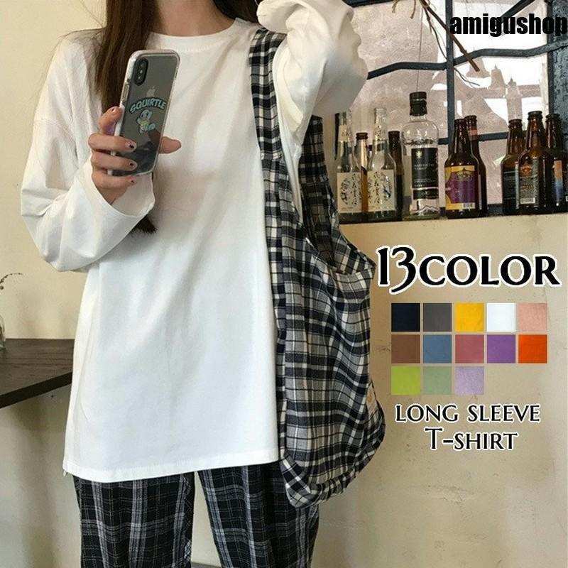 ロングTシャツ 長袖Tシャツ カットソー レディース 婦人服 トップス ラウンドネック クルーネック シンプル ゆったり ビッグシルエット おし 無地