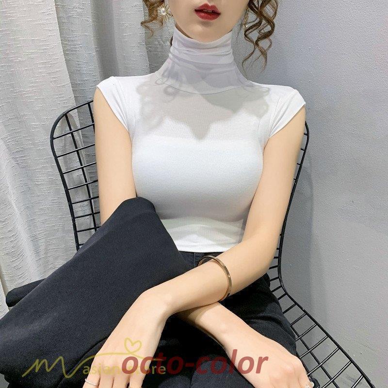 シャツ シャツ レディース 2021 着痩せ カットソー 半袖 ハイネック おしゃれ カジュアル 無地 ストレッチ インナー 5色 夏コーデ タイト 通勤通学