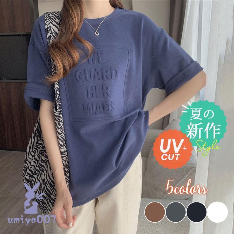 tシャツ レディース 半袖 カットソー 夏 春 トップス 文字 UV プルオーバー インナー 大きめ 体型カバー ビッグシルエット ナチュラル 薄手