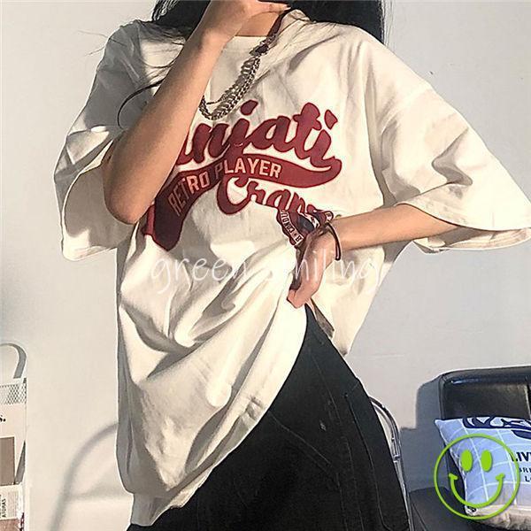 シャツ レディース 夏 半袖 韓国 ロゴ カットソー ネック トップス ゆるシャツ 丸首 プルオーバー カジュアル プリント 白 グレー グリーン ホワイト