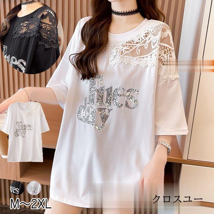 カットソー Tシャツ レディース 夏 トップス おしゃれ 英字柄 切り替え 大きいサイズ レース 無地 ゆったり カジュアル 丸首 夏服 体型カバー tシャツ 2022