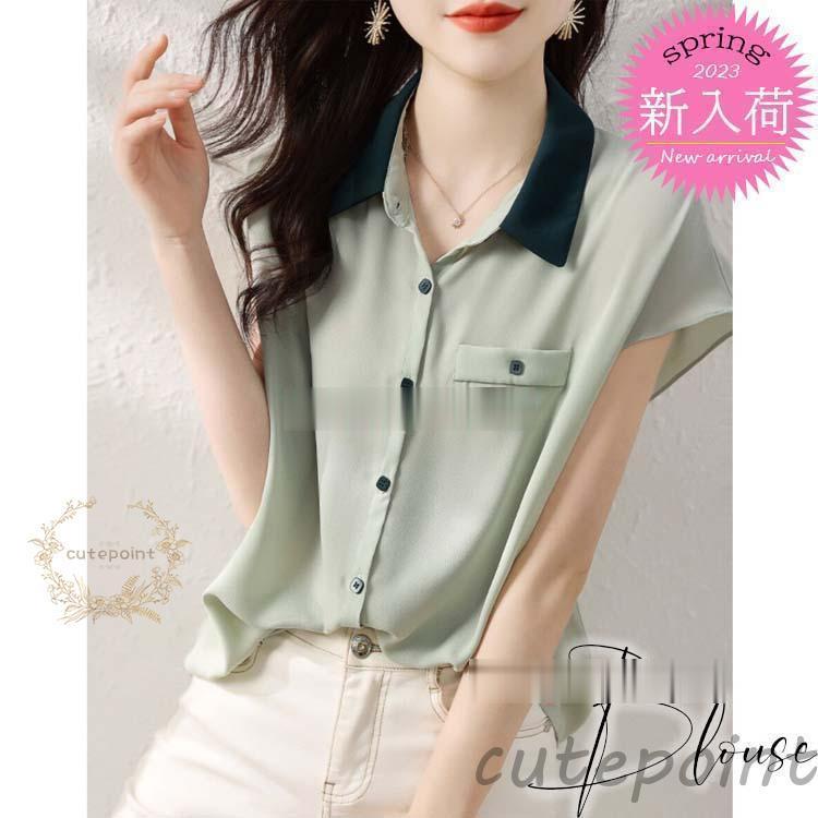 ブラウス レディース 40代 夏 半袖ブラウス フレンチスリーブトップス オシャレブラウス オフィスブラウス 大人通勤 ゆったりシャツ 配色折り襟シフォンシャツ