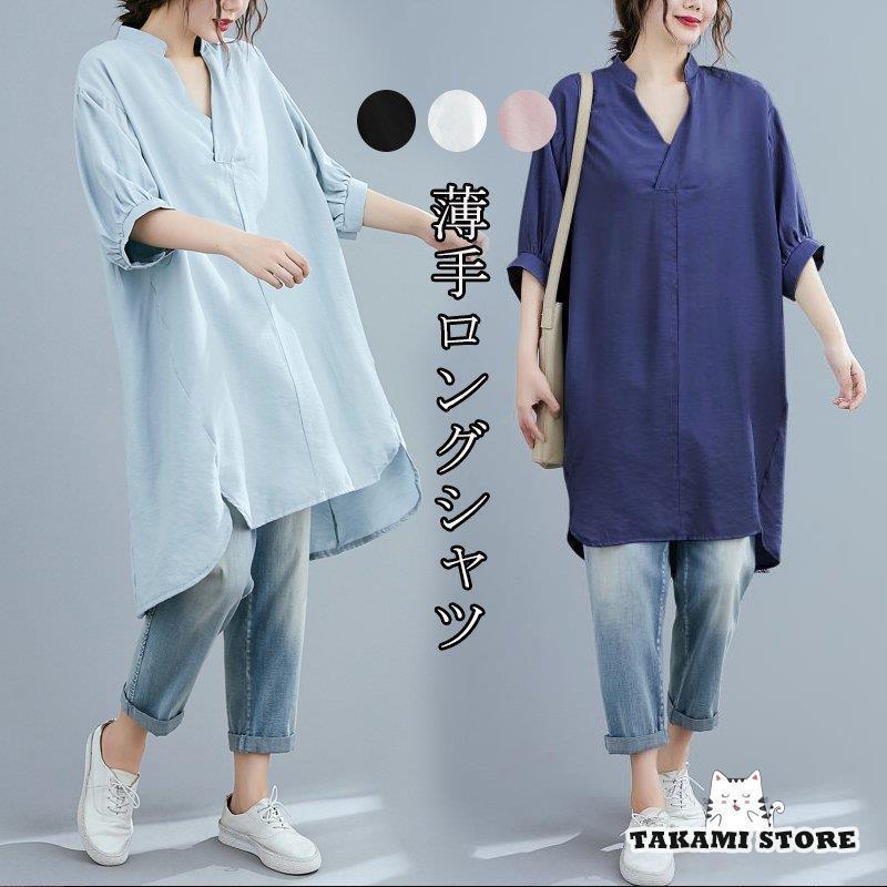 シャツ ロングシャツ ワンピース 無地 レディース チュニック 体型カバー 着痩せ 7分袖 5分袖 vネック ログワンピース カジュアル 薄手 通勤 通学 春