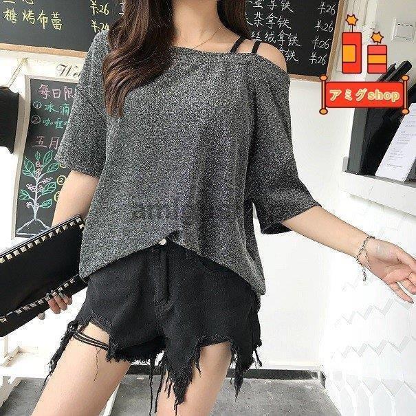 トップス カットソー 半袖 Tシャツ ニット オフショルダー ワンショル シンプル 春夏 レディース ルーズ
