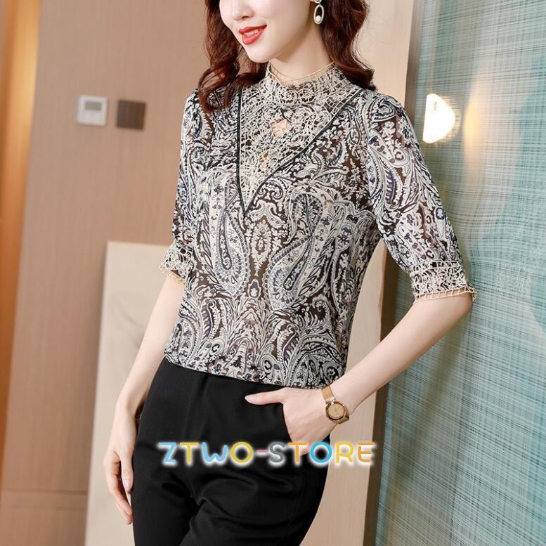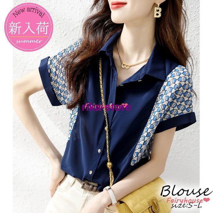 ブラウス レディース 40代 春夏 オフィスブラウス 幾何柄シフォンシャツ オシャレブラウス 半袖トップス 韓国風 大人 上品 ゆったりシャツ 30代 50代 通勤OL
