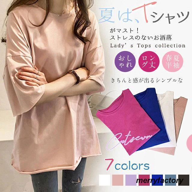 Tシャツ 5分袖 7分袖レディース カットソー ゆったり 笑顔 ロングT 薄手 カジュアル おしゃれ トップス シンプル 着まわし 通勤 涼しい