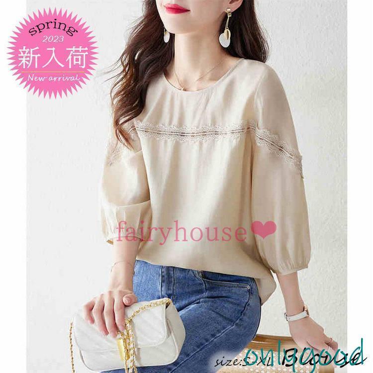 ブラウス レディース 40代 春夏秋新作 オシャレブラウス 七分袖ブラウス パフスリーブトップス レース刺繍 韓国風大人 上品 ゆったりシャツ 30代 50代 通勤