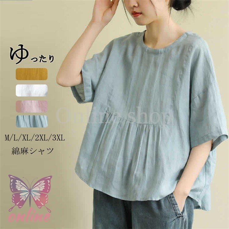 ブラウス レディース シャツ チュニック Aライン フレア カットソー トップス 夏 5分袖 無地 体型カバー ゆったり 大きいサイズ 30代 可愛い 綿麻 きれいめ 40代