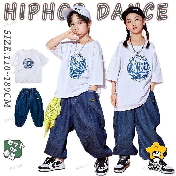 デニムパンツ ホワイトTシャツ ワンポイント キッズ ダンス衣装 セットアップ ゆったり デニム ネイビー カジュアルシャツ 半袖 トップス ダンスパンツ ダ 白