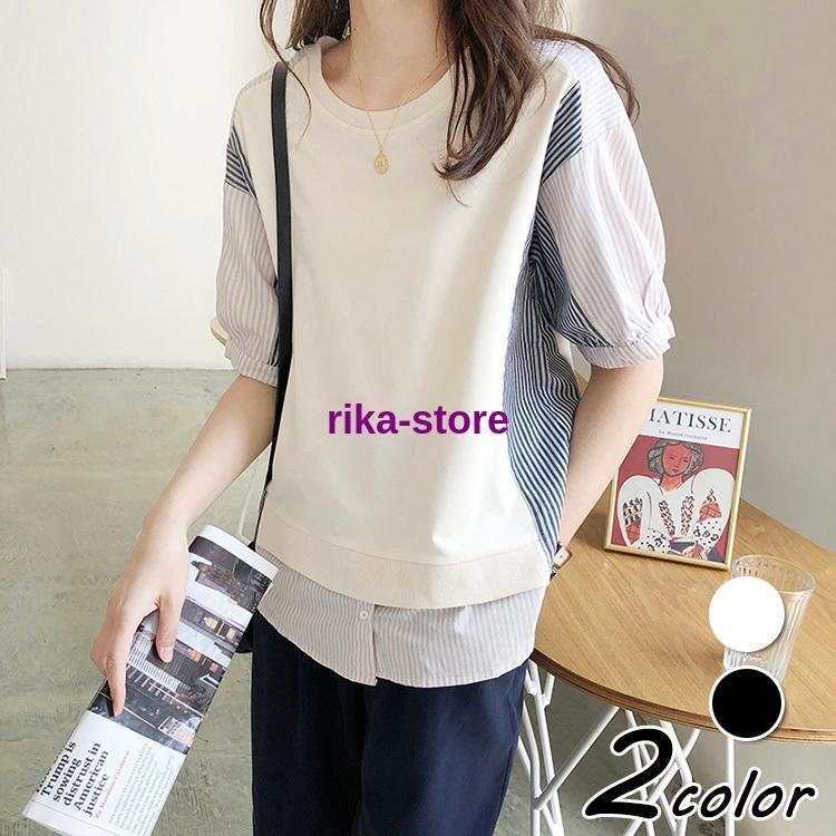 ブラウス レディース 40代 春夏新作 オシャレブラウス ボーダー柄切り替えTシャツ 半袖トップス フェイクレイヤードブラウス 通勤 ゆったりTシャツ 韓国風 大人