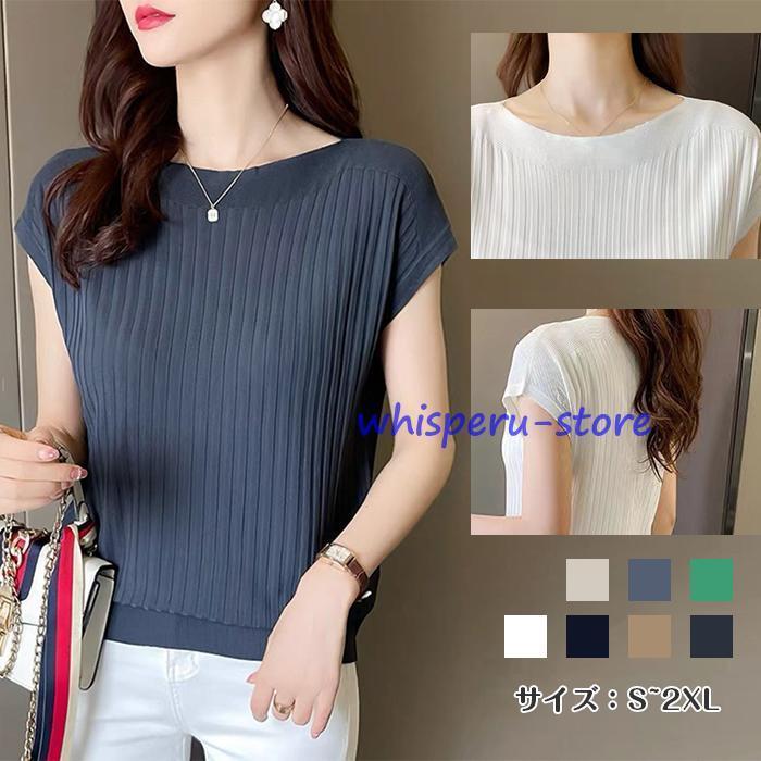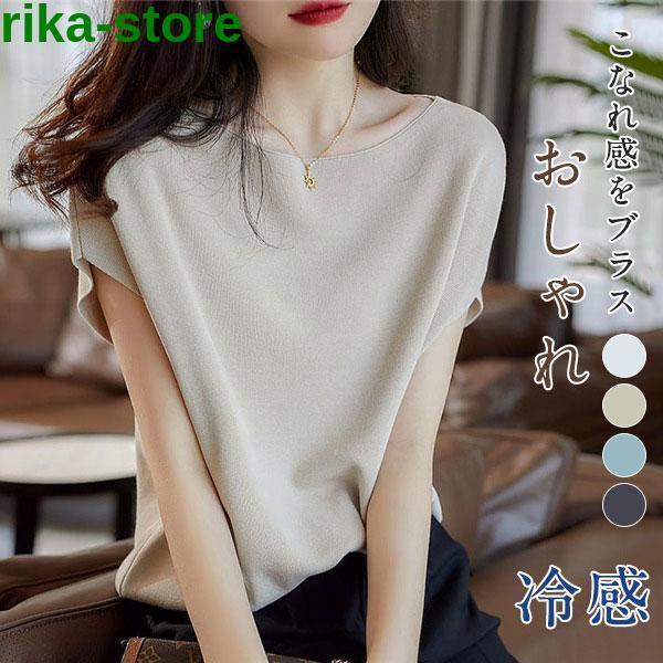接触冷感 サマーニット リブニット ニット シャツ カットソー 半袖 ネック レディース 夏 トップス シンプル 無地 重ね着 インナー 涼しい