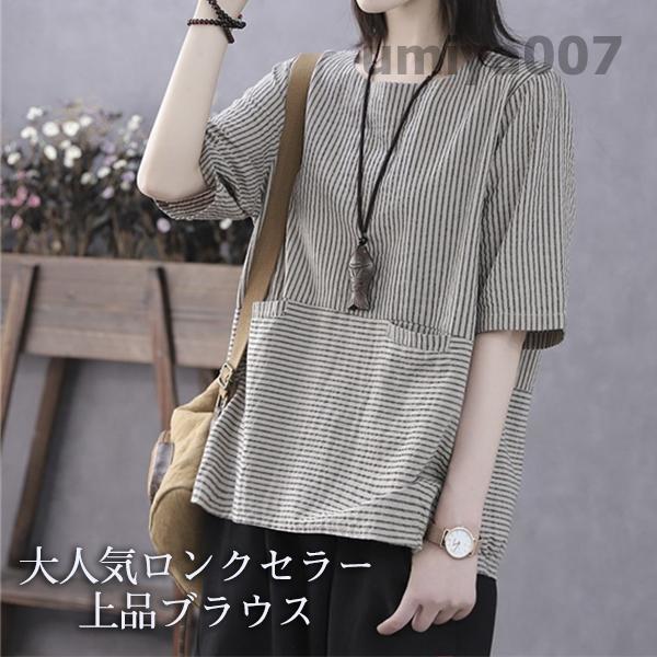ブラウス トップス チュニック レディース リネン ストライプ シャツ 春 夏 ゆったり ラウンドネック シンプル オーバーサイズ 体型カバー