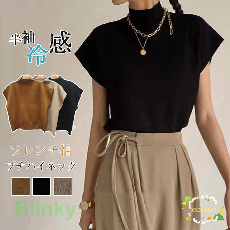 Tシャツ ニットトップス フレンチスリーブ レディース リブニット 半袖 プチハイネック 無地 二の腕カバー 冷感 春夏 フラッタースリーブ