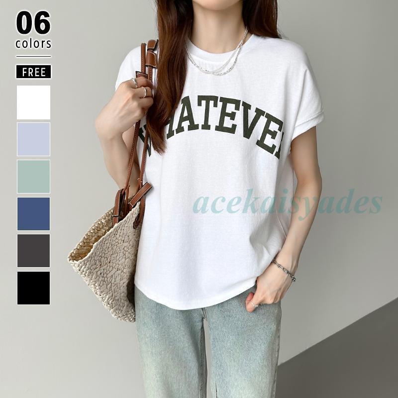 tシャツ ロゴプリント レディース 半袖 コットン天竺 ラウンドヘム フレンチスリーブ 体型カバー WHATEVER 春 秋 おしゃれ ビックシルエット 夏