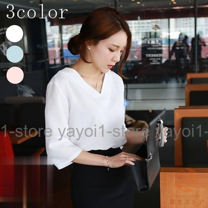 Tブラウス シャツ スーツ インナー ブラウス vネック 七分袖 フレアスリーブ オフィス カジュアル レディース トップス スキッパーシャツ カットソ… フォーマル