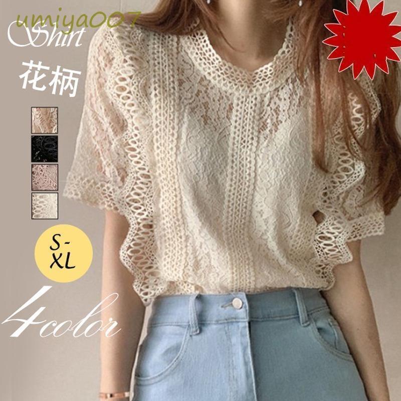 ブラウス レディース 半袖 レース トップス 総レース シースルー シャツ ハイネック 花柄 袖コンシャス 通勤 日常 細身 夏服 普段着