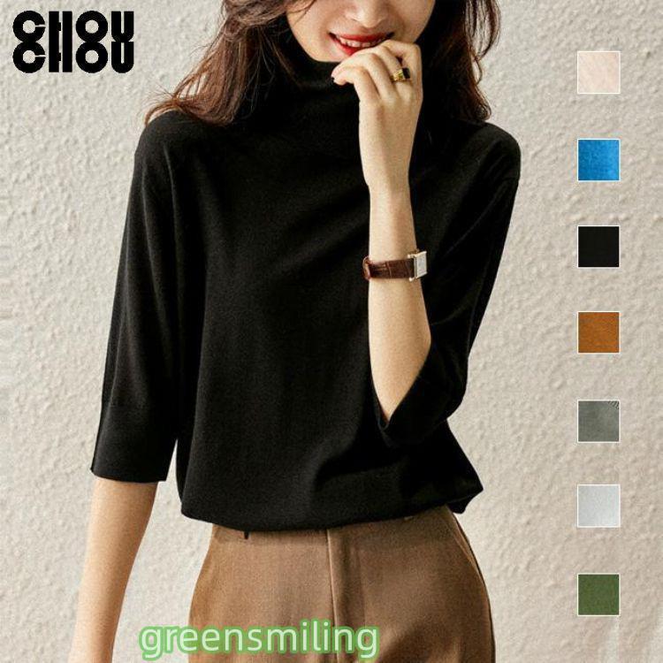 ニット ハイゲージ カシミヤタッチ 洗える レディース 五分袖 ハイネック シンプル トップス ニットソー タートルネック