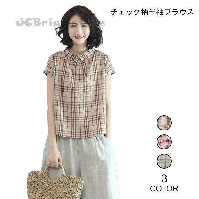 ブラウス 半袖 チェック柄 レディース リネンシャツ ゆったり 半袖ブラウス お洒落 Tシャツ シャツ 女性 薄手 レトロ 可愛い トップス