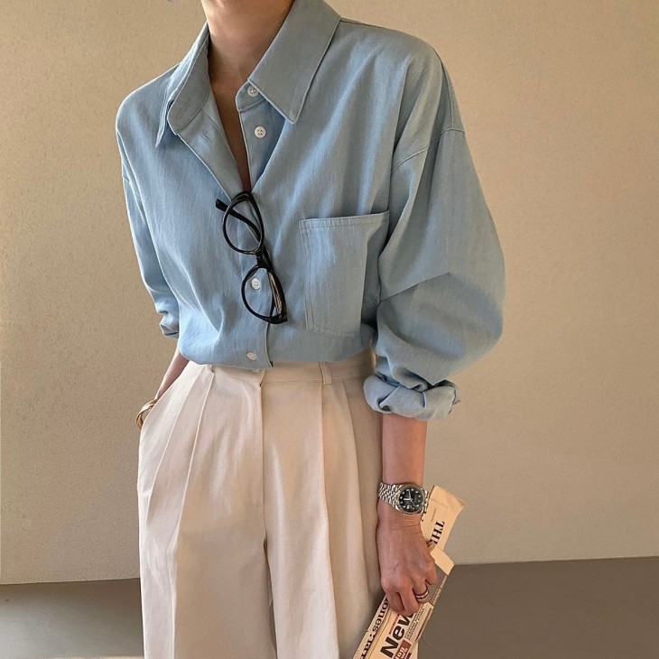 デニム風 オーバーサイズ シャツ ブルー シンプル 無地 きれいめ カジュアルレディースファッション トップス シャツ ブラウス