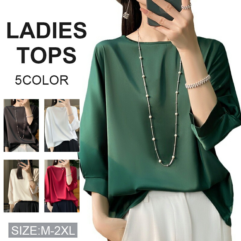 ブラウス サテン ツルツル 7分袖 レディース シャツブラウス プルオーバー クールネック 無地 tシャツ 七分袖 トップス 体型カバー インナー 大人 薄手 光沢感 普段着 カジュアル 通勤 肌着