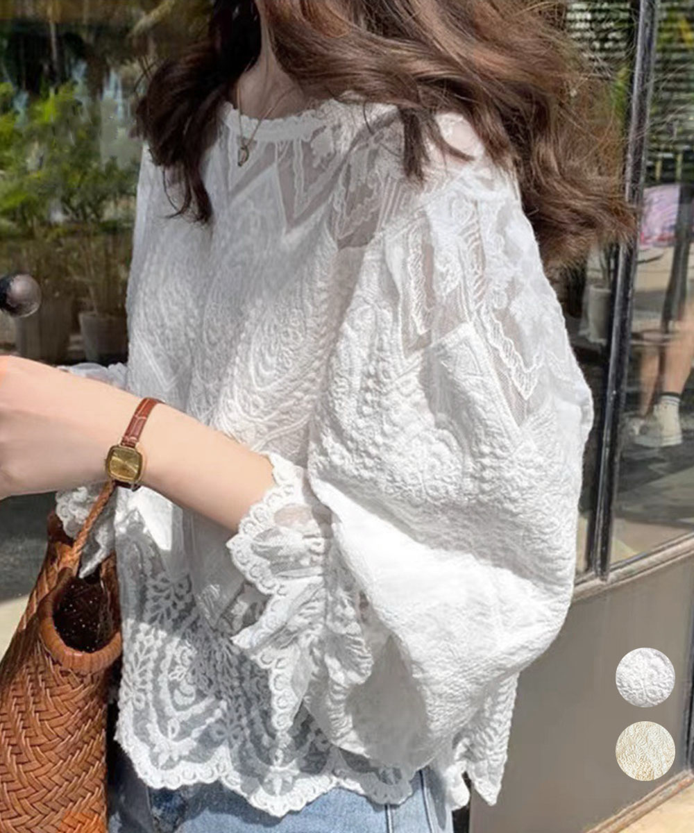 レース透かし袖ボリュームブラウス 春夏 レースブラウス透け感 刺しゅう エレガント パフスリーブ フェミニン スカラップ裾 シースルーきれいめトップス miniministore 617SY デート服