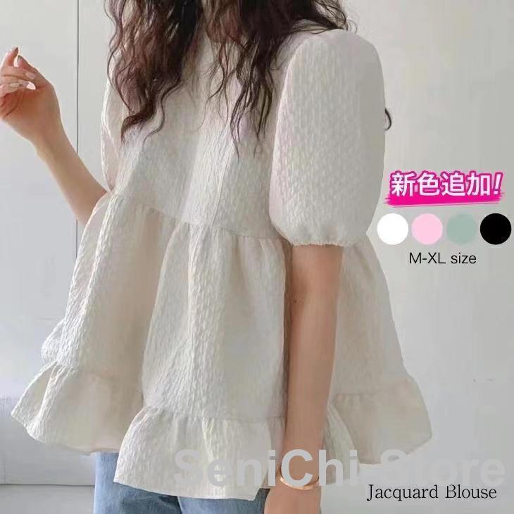 ジャガードブラウス エンボス加工 Aライン 裾フリル ブラウス バルーン袖 半袖 無地 トップス 夏 レディース フレア 春