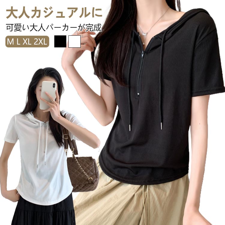 レディース 接触冷感 フード付きTシャツ 夏 半ジップパーカー ハーフジップ 半袖パーカー カットソー トレーナー 韓国ファッション プルオーバー 薄手 おしゃれ 大人 カジュアル トップス