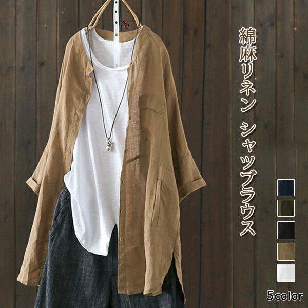 シャツ レディース 七分袖 ブラウス トップス 綿麻 麻混 羽織 シャツブラウス 立ち襟 春 夏 秋 長袖 ゆったり オシャレ 通勤 体型カバー