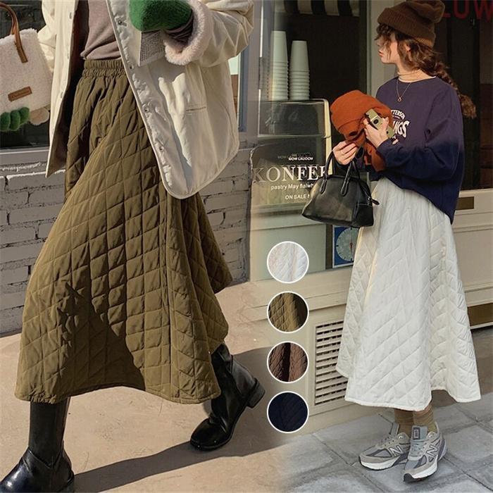 スカート キルティング 秋冬 暖か レディース キルティングスカート ボトムス ロング フレア ミモレ丈 膝下 Aライン ハイウエスト ミモレスカート