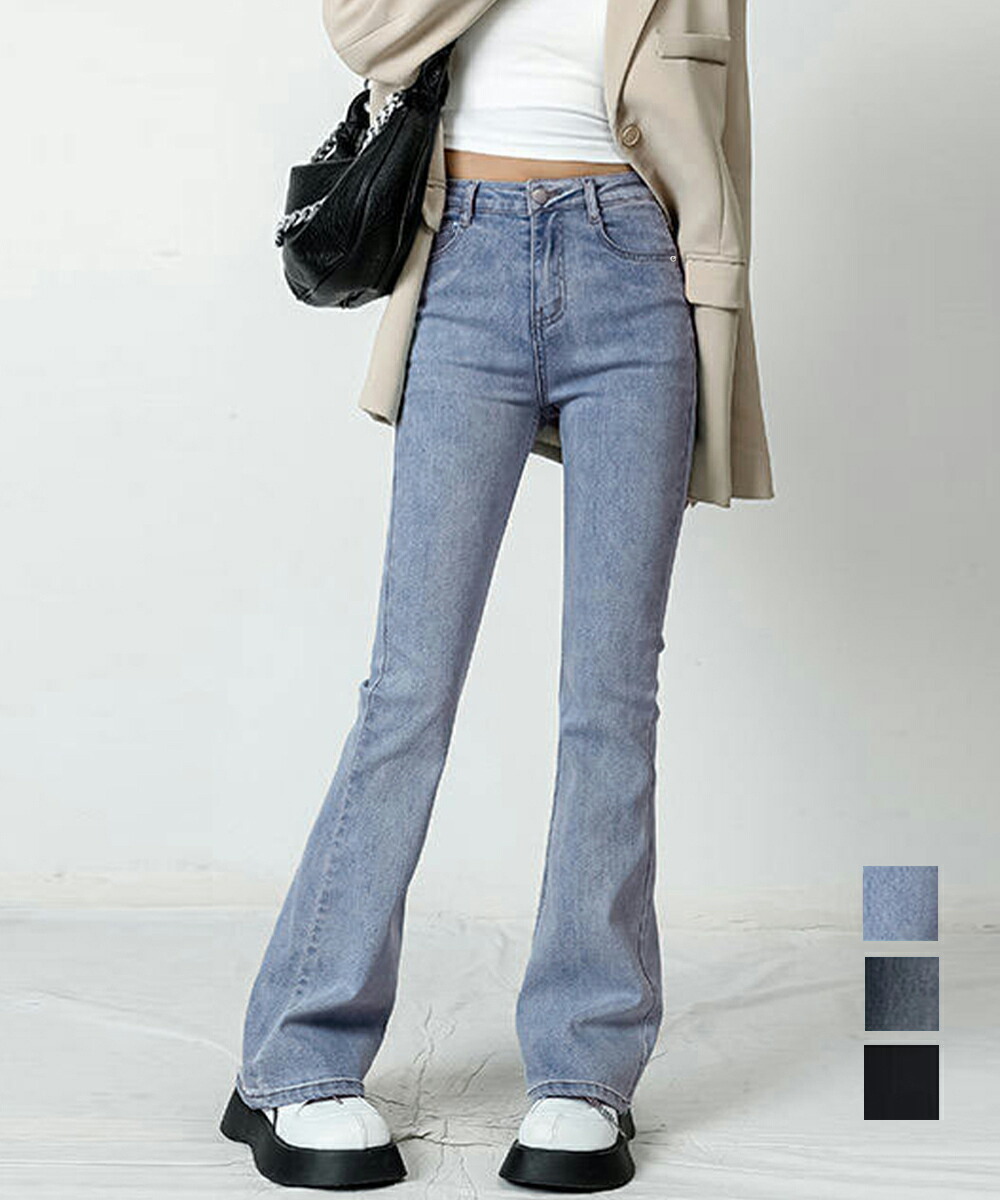 フレアデニムパンツ ストレッチパンツ韓国 レディース ハイウエスト セミフレアパンツ 美脚 ロングパンツ カジュアルジーパン 着やせ 細身ボトムス miniministore 1HAN アメカジパンツ