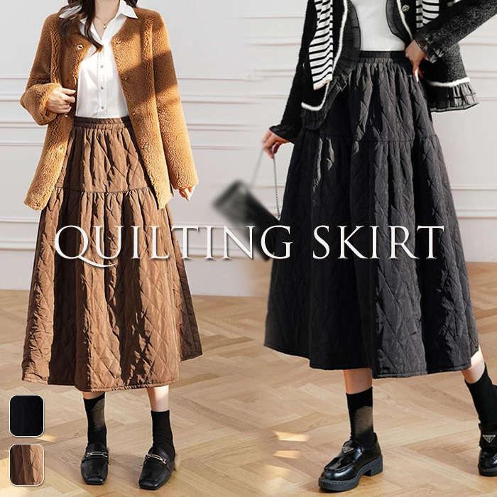 スカート 中綿 ロング 秋冬 レディース ボトムス キルティングスカート フレア Aライン ロングスカート ロング丈 ハイウェスト ポケット ボリューム ゆっ ゴム