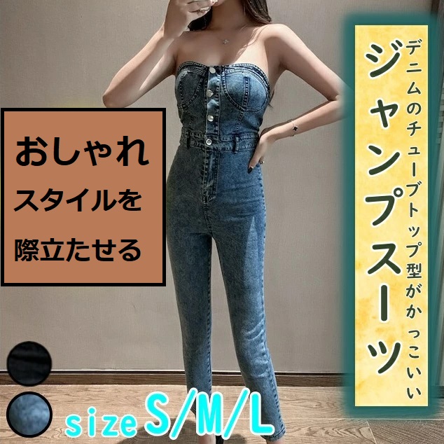 ジャンプスーツ レディース オールインワン サロペット デニムパンツ スキニーパンツ 膝下 袖なし チューブトップ スリム タイト 細身 ストレート 切り替えデザイン ハイウエスト