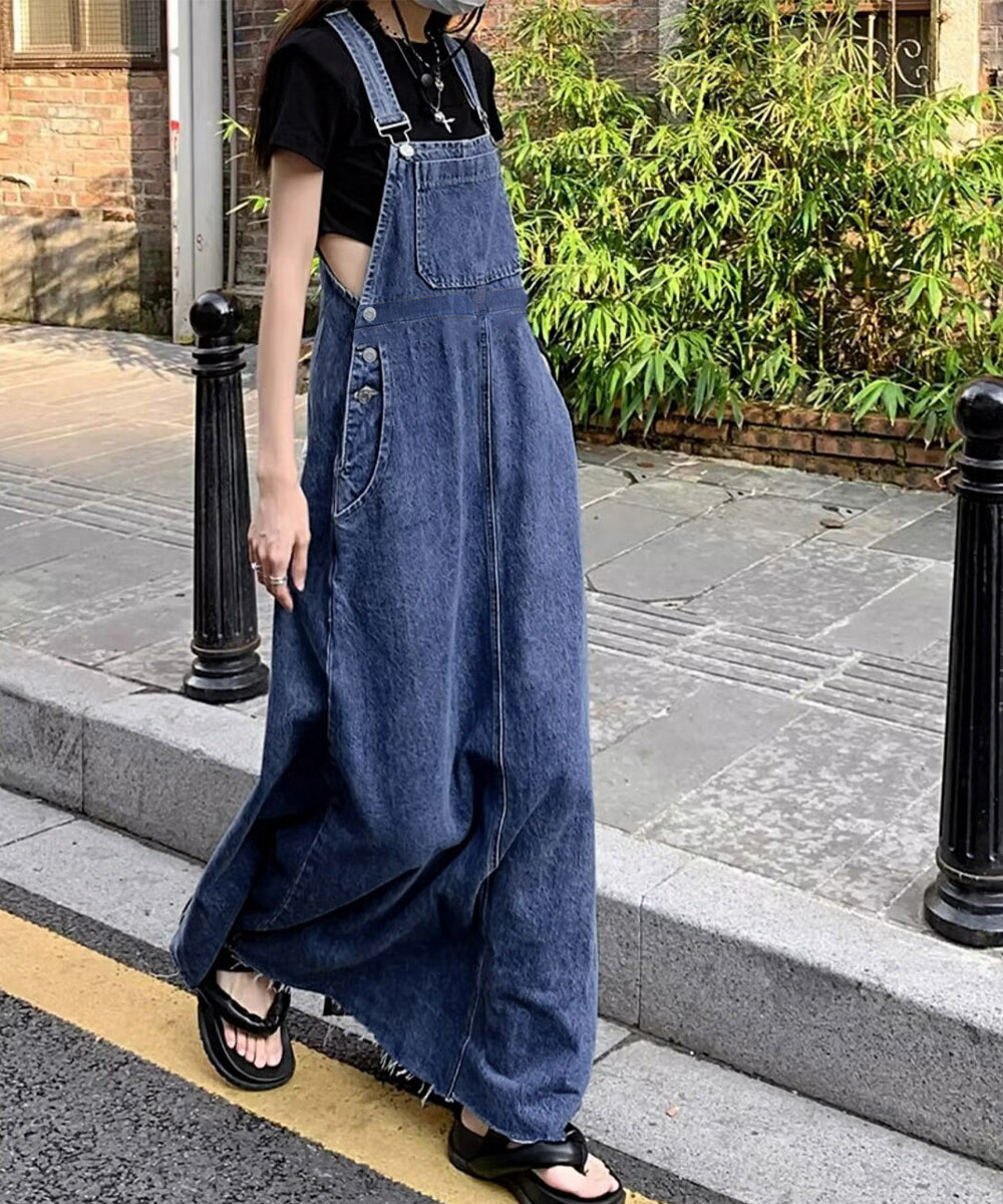 サロペットスカート韓国風デニムジャンスカ マキシ丈ジャンパースカート デニムサスペンダーワンピーススリット レイヤードデニムワンピース韓国風 miniministore 着やせロングスカート