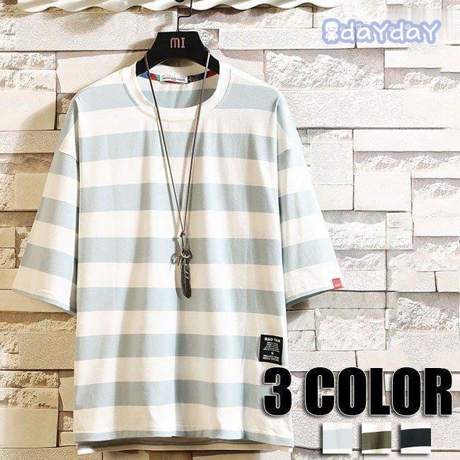 半袖Tシャツ メンズ ボーダー 大きいサイズ Tシャツ クルーネック トップス 丸首 メンズ用 3色 カットソーTシャツ