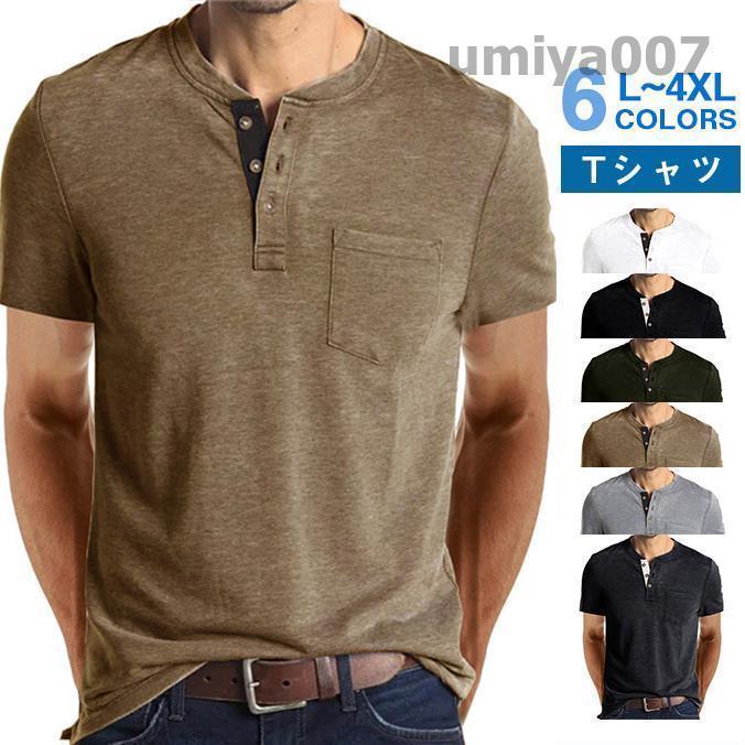 Tシャツ メンズ ヘンリーネック 半袖 無地 春 夏 半袖Tシャツ カットソー おしゃれ 丈夫 カジュアル アメカジ ポケット付き