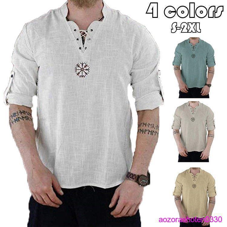 綿麻混紡 シャツ メンズ 長袖 無地 刺繍 カジュアルシャツ 春夏秋 通勤プルオーバー トップス 2019 新作 4色 立ち襟