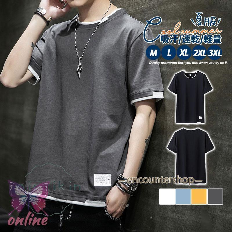 Tシャツ 半袖 メンズ 春夏 トップス レイヤード 重ね着風 カットソー tシャツ インナー 吸汗速乾 シンプル 薄手 ペア コーディネート 男の子 大学生 コーデ