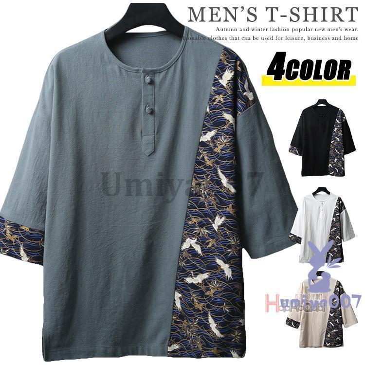 ヘンリーネック tシャツ メンズ 綿麻 5分袖 五分袖 鶴柄 切り替え 半袖tシャツ 40代 50代 メンズファッション チャイナボタン