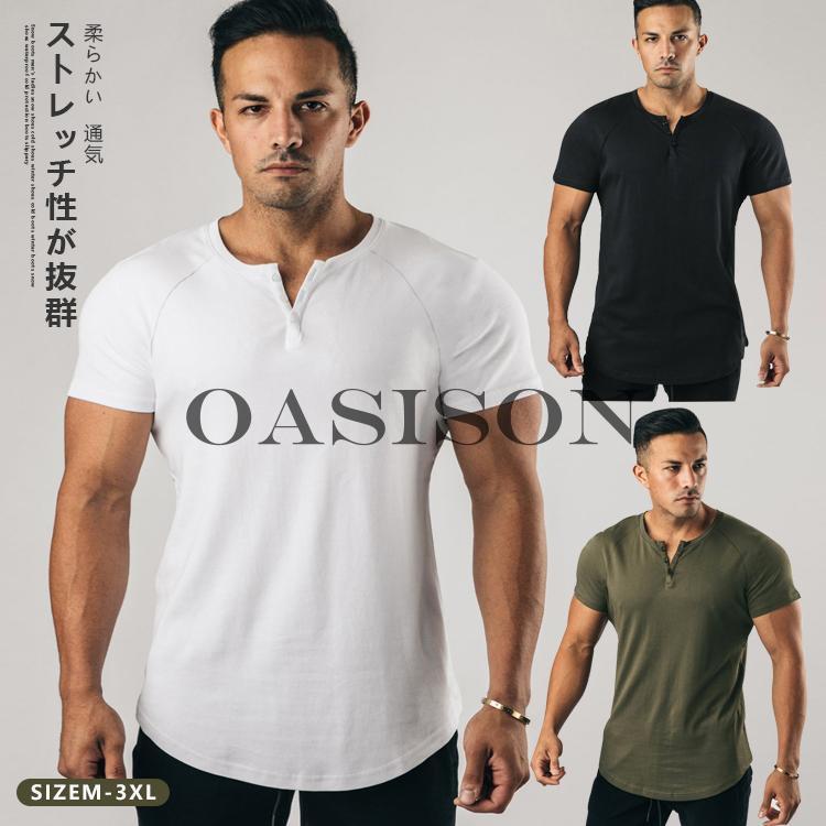 半袖 Tシャツ ヘンリーネック ラグランスリーブ メンズ ボタン 丸首 レイヤード 無地 カットソー トレーニングウェア 春夏 オシャレ スポーツウェア