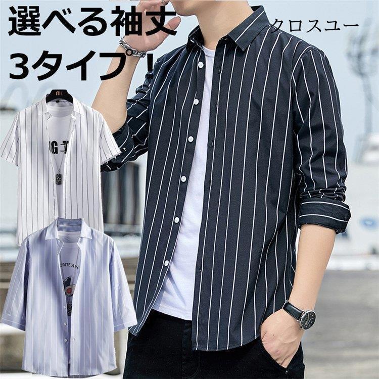 シャツメンズ半袖 開襟シャツ 七分袖シャツ 長袖シャツ春秋 ストライプ柄 夏 白 ワイシャツ おしゃれ ビジネスシャツ 3タイプ選べる袖丈 シャツ