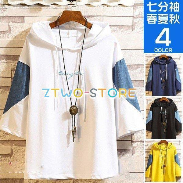 プルオーバーパーカー メンズ カジュアル 七分丈 Tシャツ フード付き 半袖パーカー お兄系 夏物 新作 ルームウェア