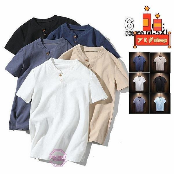 リネンTシャツ メンズ 半袖Tシャツ Tシャツ 半袖 綿麻Tシャツ 無地 夏 夏物 リネン スリム 綿麻 父の日 ボタン付き