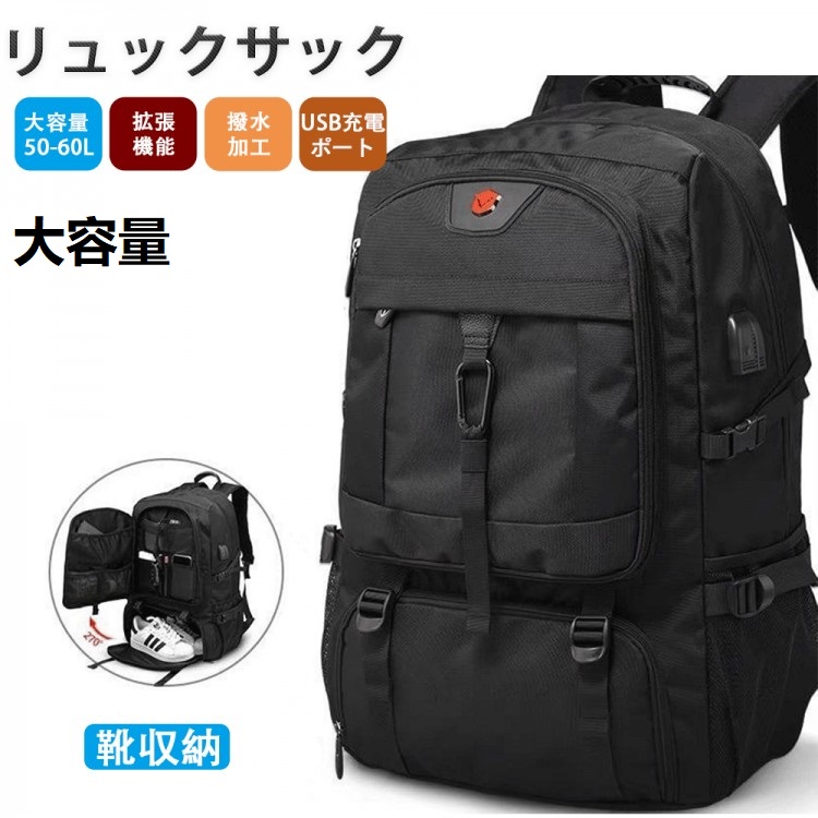 PC リュック 通勤バッグ リュック リュックサック 大容量 50L 60L 拡張機能 ビジネスリュック ラップトップバック バックパック 撥水 USB充電ポート付き 靴収納 耐久性 アウトドア メンズ 旅行 多機能 通気性 耐衝撃 地震 緊急避難必要品