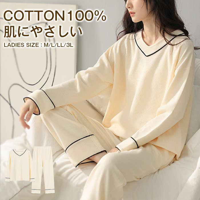 ルームウェア 綿100% レディース 長袖 秋冬 春秋上下セット パジャマ ナイトウェア 寝間着 シャツパジャマ カットソー プルオーバー 大人用 女性 入院 Vネック
